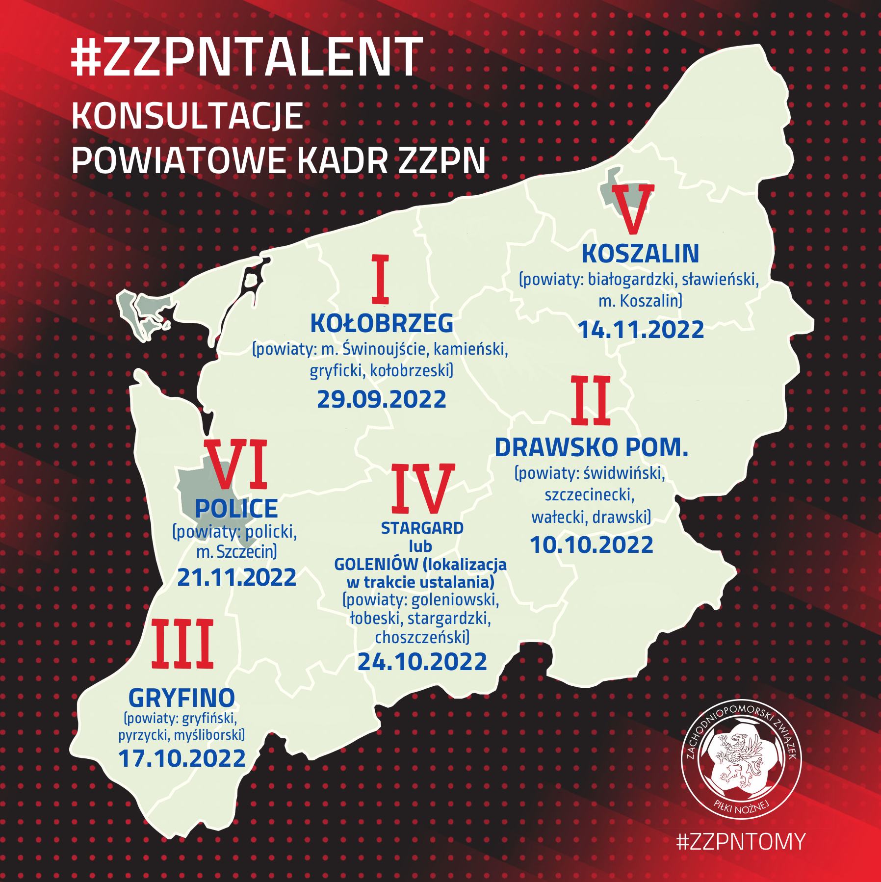 Rozpoczynamy cykl KONSULTACJI POWIATOWYCH #ZZPNTalent w 6 lokalizacjach – TRENERZE ZGŁOŚ SWOJEGO UTALENTOWANEGO ZAWODNIKA przez FORMULARZ ONLINE - do udziału w wybranym terminie poniżej. Podział na strefy zaprezentowany jest na mapie województwa na poniższej grafice.