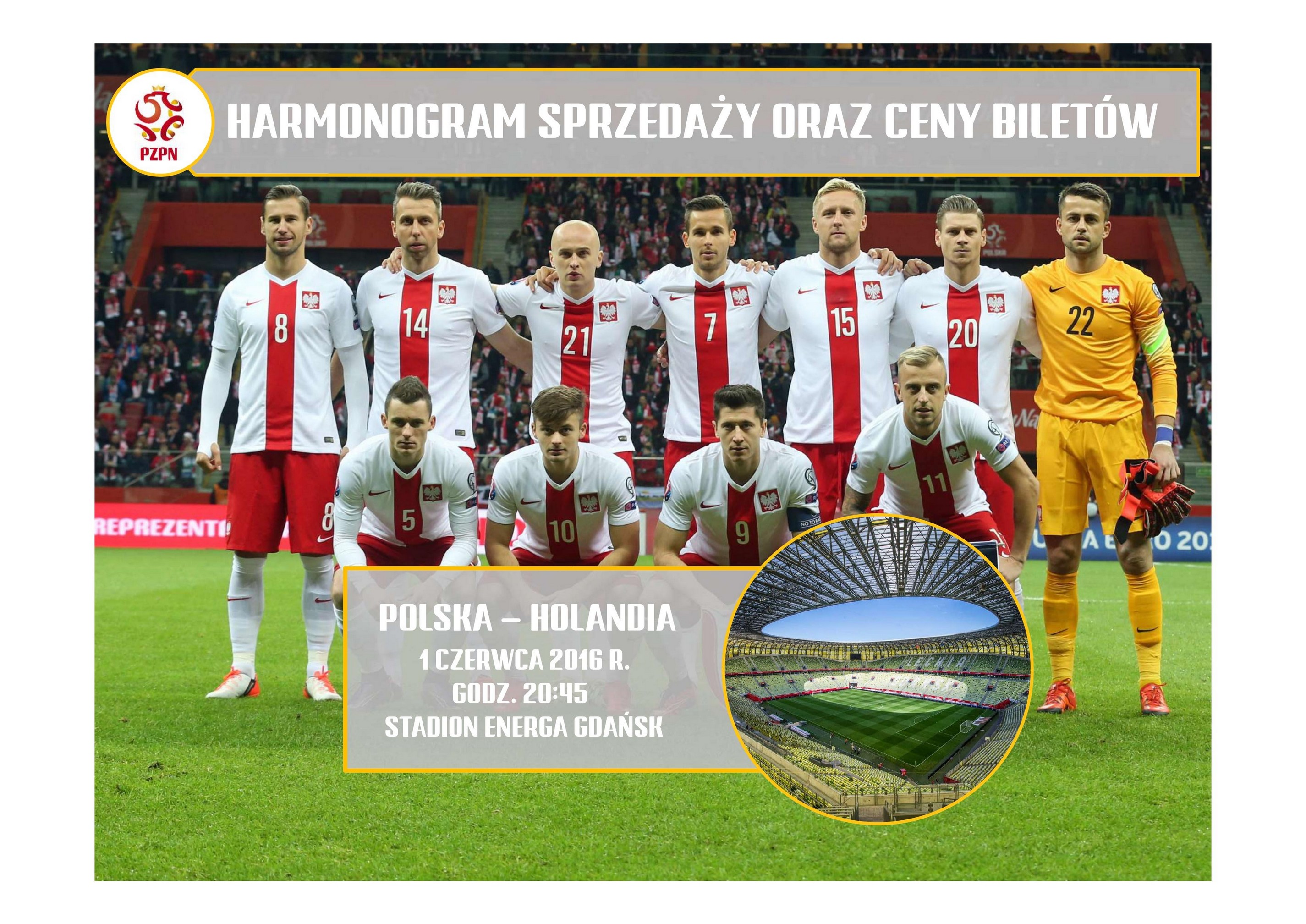 Zachodniopomorski Związek Piłki Nożnej informuje, że przyjmuje zamówienia na bilety na mecz towarzyski Polska - Holandia, który rozegrany zostanie w dniu 01.06.2016 roku w Gdańsku.