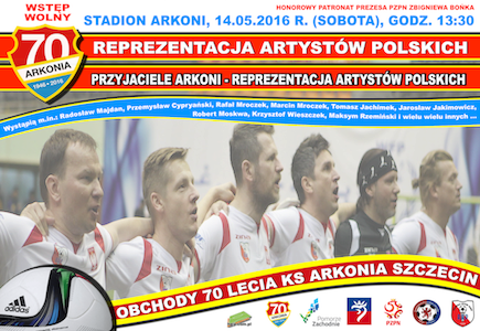 W sobotę 14.05.2016 r. o godzinie 13 30 na boisku przy ul Arkońskiej rozegrany zostanie arcyciekawy mecz piłki nożnej pomiędzy Przyjaciółmi Arkoni, a Reprezentacją Artystów Polskich. W składzie obu drużyn wystąpi wielu aktorów, piosenkarzy, artystów oraz byłych piłkarzy reprezentacji Polski .