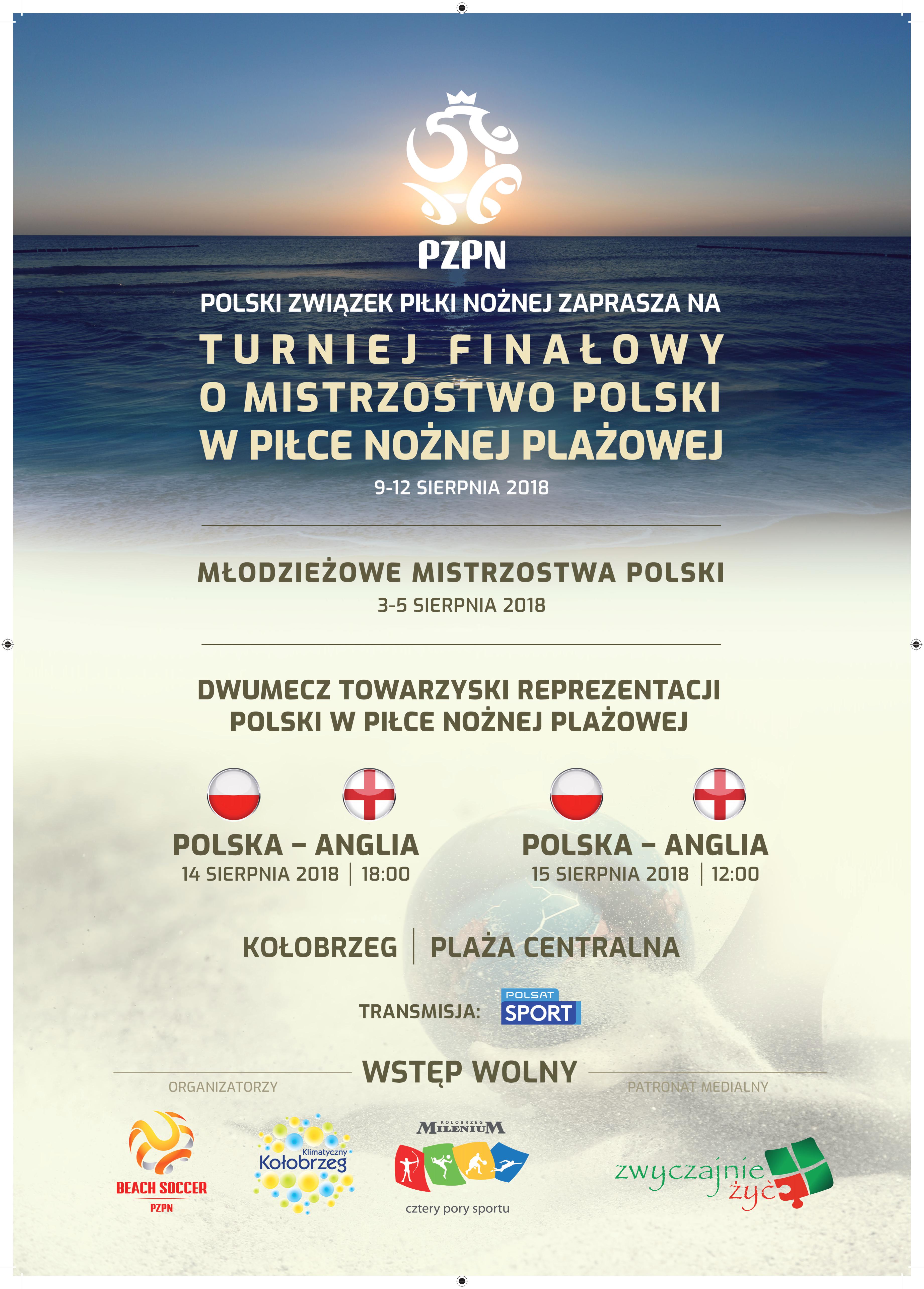 Zanim na kołobrzeskiej plaży zaprezentują się reprezentacje Polski i Anglii kibice będą mieli okazję śledzić trzy inne imprezy. Najpierw zaplanowane są młodzieżowe mistrzostwa Polski do lat 21. Później na piasku o medale mistrzostw Polski rywalizować będą seniorzy i seniorki.