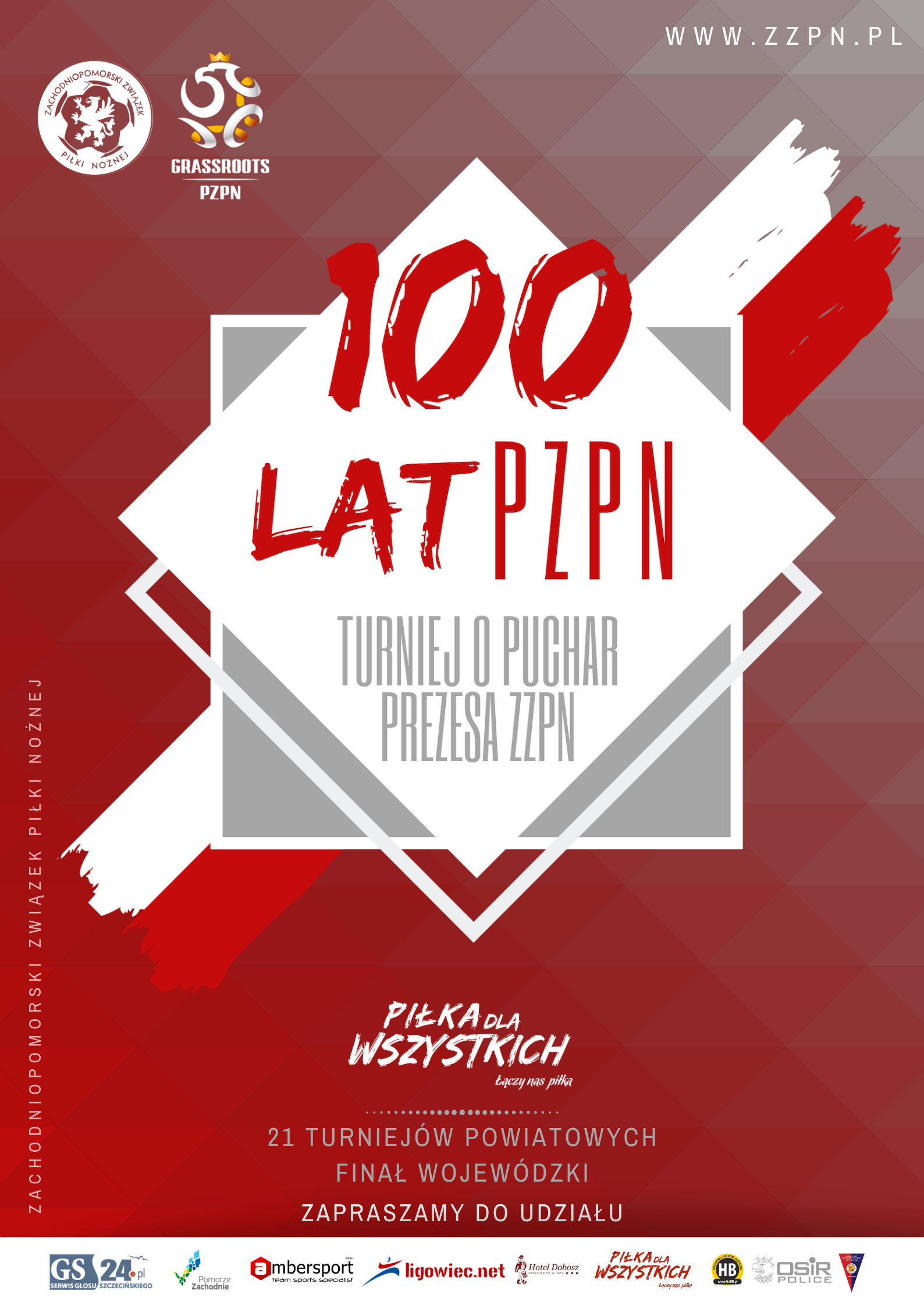 Z okazji 100-lecia PZPN Zachodniopomorski Związek Piłki Nożnej zaprasza wszystkich piłkarzy do wzięcia udziału w otwartym turnieju piłkarskim. Żeby wziąć w nim udział nie trzeba być zrzeszonym w związkowych strukturach. Co ważne, wszystkie koszty udziału w imprezie pokrywa Związek. Udział w turnieju jest bezpłatny. Jedyne dwa ograniczenia to: ukończone 18 lat oraz posiadanie statutu amatora (w turnieju nie mogą grać piłkarze mający profesjonalny kontrakt z klubem). Zespoły uczestniczące w turnieju nie muszą posiadać przynależności klubowej.