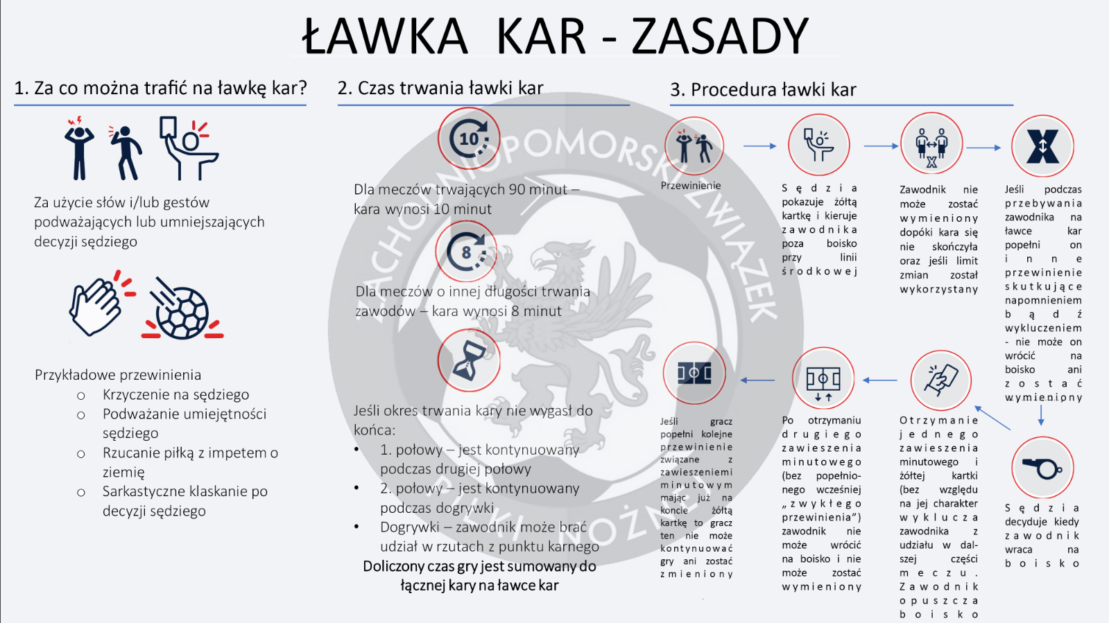 Zachodniopomorski Związek Piłki Nożnej pilotażowo wprowadza w sezonie 2020/21 na zawodach klasy A,B oraz rozgrywkach młodzieżowych Junior A1, A2, B1, B2, WLT Starszycb i Młodszych rozwiązanie w postaci kar wychowawczych za negatywne zachowania wobec sędziów. Poniżej prezentujemy wyciąg z Regulaminu Rozgrywek ZZPN w sezonie 2020/21 oraz jego graficzną ilustrację. UWAGA – system kar minutowych nie obowiązuje w rozgrywkach Pucharu Polski ZZPN.